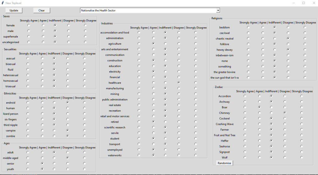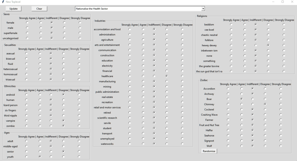 What we’re looking at is how I’ve programmed the preferences for the ‘Nationalise the Health Sector’ policy, and you can see that there’s not a lot going on for agrees. I think this is why my people are very conservative. This needs an update and you’ll see my update here: